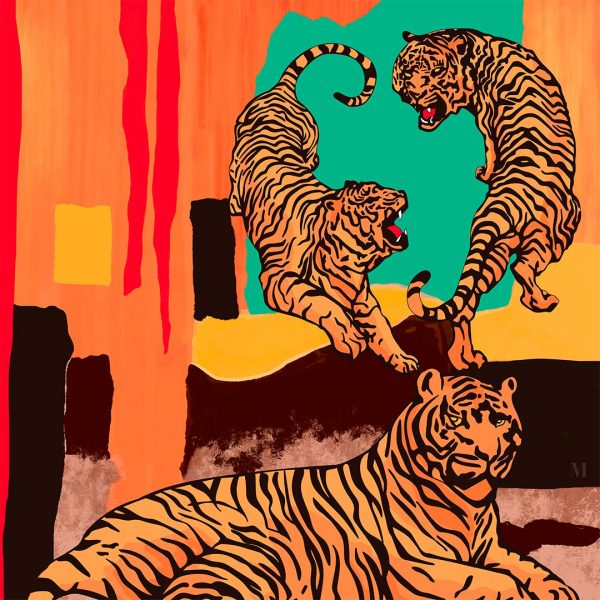 El pañuelo “Tigres” se inspira en la fuerza salvaje del tigre de Bengala (Panthera tigris tigris) para formar un conjunto poderoso y salvaje, de colores vivos y perfecto para combinar con prendas de todo tipo.